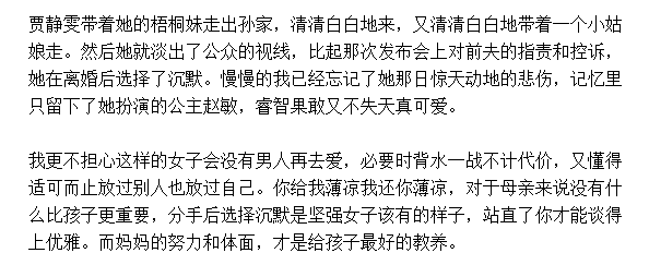 我被那天她的样子再次惊到,她是个明星,以如此不堪的方式自爆家丑,一定是没有退路的最后一搏了。但至少她没有放弃,并且不愿意妥协,女人如果真到了不惜一切代价的时刻,最后退缩的往往是男人。孩子面前,女人的情感永远比男人更高尚更无私。