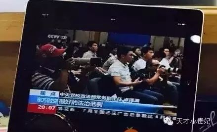 在剧组休息的间隙搬小板凳收看《东方时空》,认真学习法治精神。