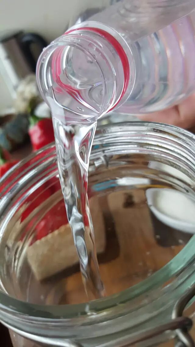 ▼ 将准备好的矿泉水倒入 考肯覆盖储物罐(1.8L 售价:19.9元) 大约占据1/2的容积。