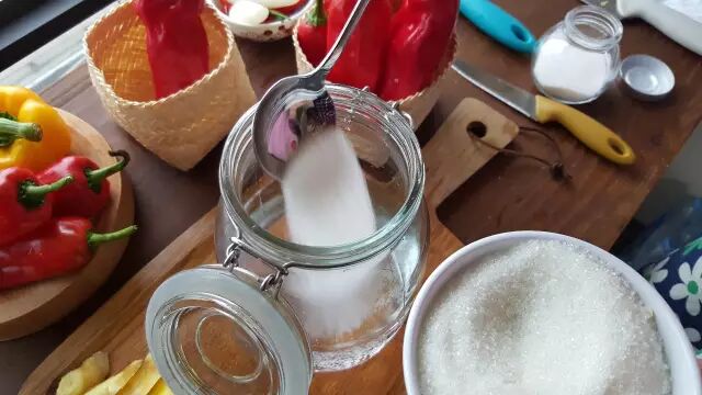 ▼ 将姜、水萝卜、辣椒、小米椒、灯笼椒依次放入 这个只卖19.9元,但是能装1.8L的“考肯覆盖储物罐”里!!
