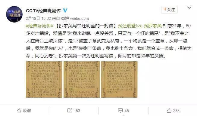 前几天,央视《经典咏流传》官方微博晒出罗家英写给汪明荃的情书。