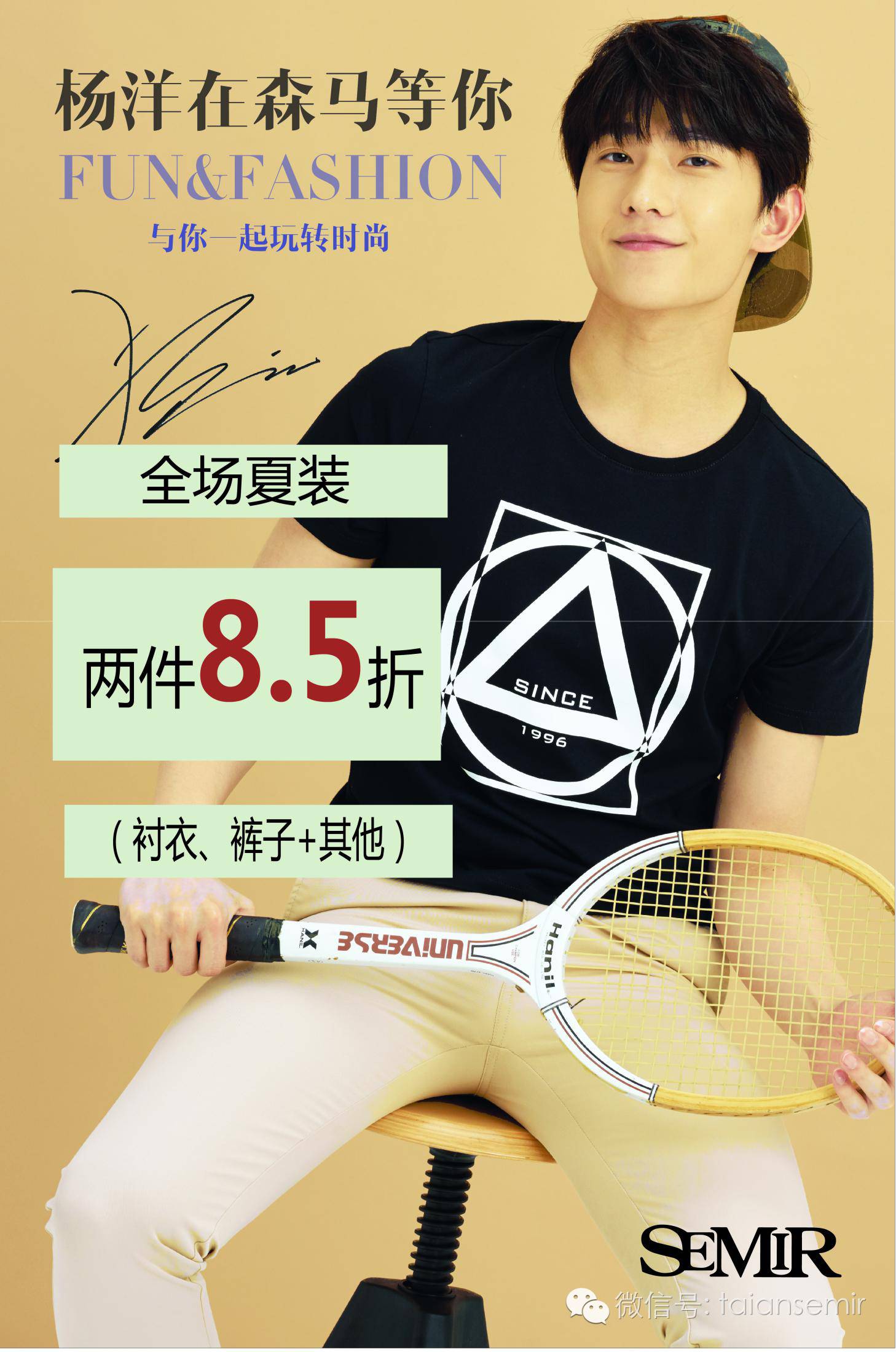 杨洋在森马等你,与你一起玩转时尚!全场夏装两件8.5折优惠,全场夏装两件8.5折优惠,快来森马一起玩转时尚吧!!!森马明星款限量发售哦!!!