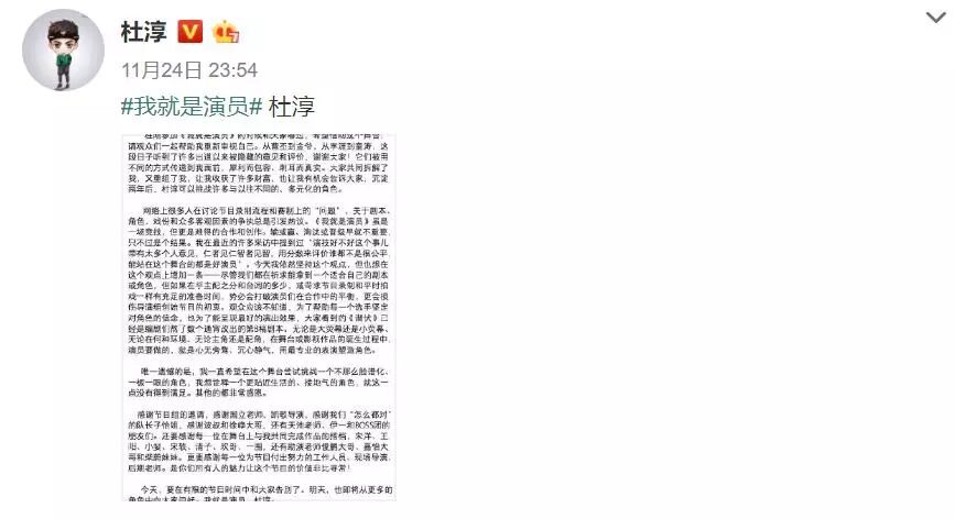 事后他也发了微博,表示对于比赛、对于结果他都很满意。“能站在这个舞台上的都是好演员”,杜淳如是说。两年的沉淀,他真的成熟了很多。