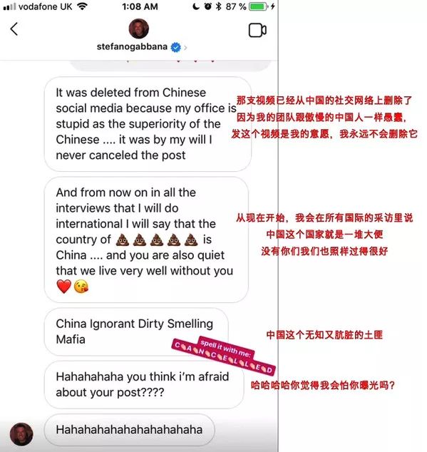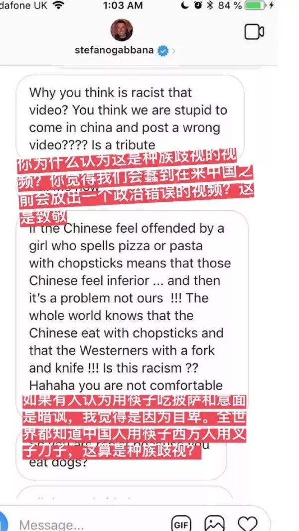 真正“作死”的缘由是设计师Stefano Gabbana的表现。在遭到亚裔模特与时尚圈人士的私信质询后,恼羞成怒的他直接爆出了多番侮辱中国人的言论。