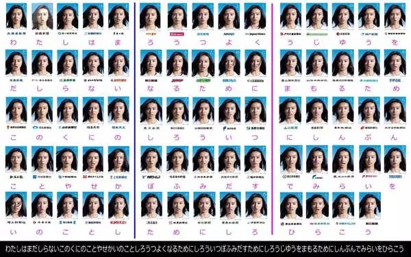 除了时尚圈的眷顾,最令海豹君惊呆的还是日本国内推“国民女儿”般的企划。平成年最后的新闻周,日本新闻协会联合74家报纸,每一家都留下一个整页放Kōki的照片,配上一个平假名字符,连起来是一整句话:我还不了解这个国家和这个世界。去了解吧,为变得更强;去了解吧,为了向前踏出一步;去了解吧,为了守护自由,用新闻开拓未来。
