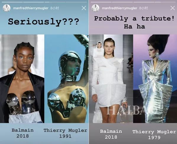 可惜还没得意多久,蒂埃里·穆勒 (Thierry Mugler) 却在Ins上发了一组对比照,直指Olivier Rousteing的“新设计”抄袭了他的昔日旧作。还暗戳戳地留下一句“Probably A Tribute Ha Ha (可能是致敬吧,哈哈) ”,果然姜还是老的辣!