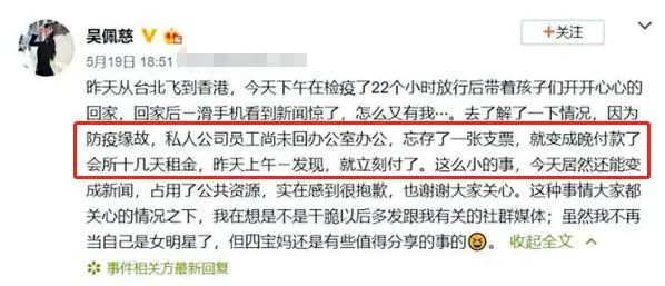吴佩慈称这次欠租是因为目前形势的原因,私人公司的员工尚未回办公室办公,忘存了一张支票。