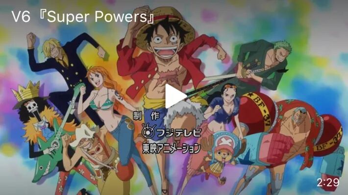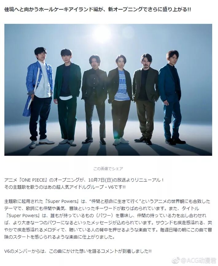 8. TV动画《海贼王》新OP《super powers》,由杰尼斯人气组合V6演唱