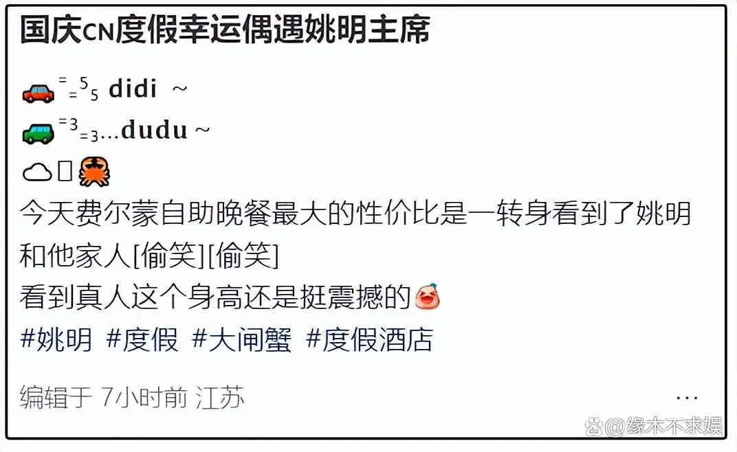 国庆出游季,明星们也纷纷卸下工作和生活的担子,选择和家人外出旅游,其中便包括姚明一家。10月4日,有多位网友在苏州偶遇姚明一家人,姚明叶莉和父母带着女儿一同外出,因为个个都是 “小巨人”,所以格外引人瞩目。