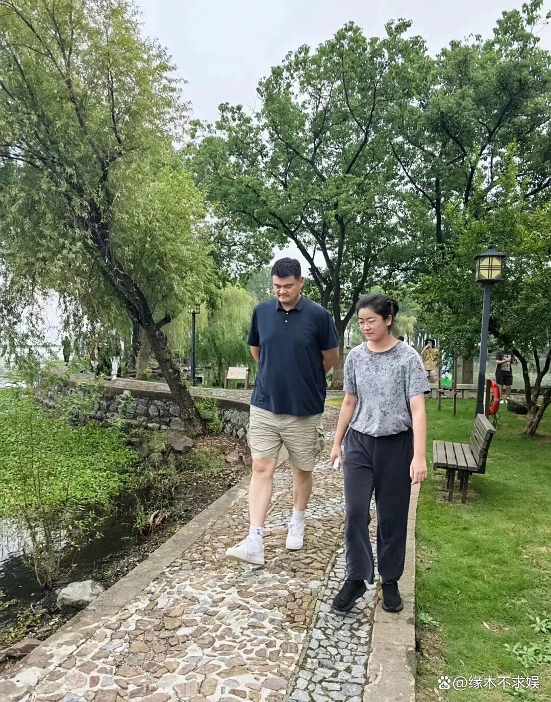 父女俩一前一后的走着,15岁的姚沁蕾穿着灰色上衣搭配深色裤子,扎起头发戴着眼镜,看着十分接地气。父女俩走在鹅卵石大道上,边走边聊,画面看着十分温馨。