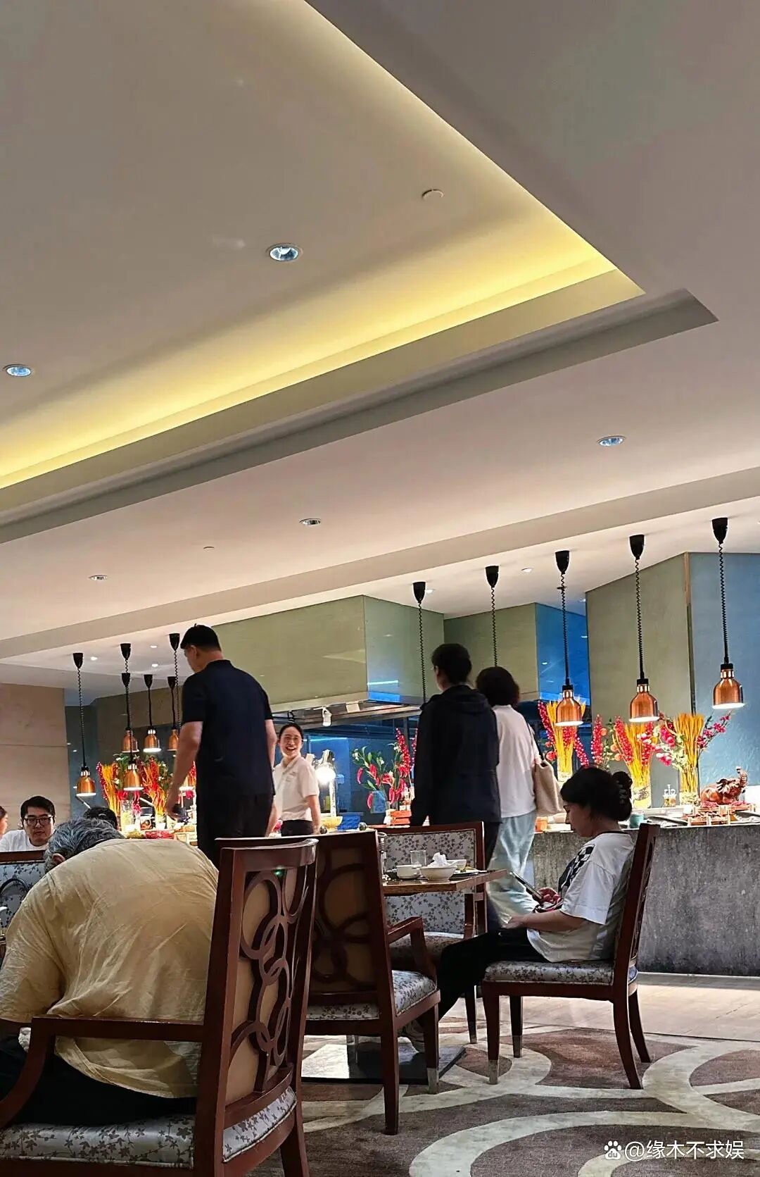 之后还有网友在费尔蒙自助晚餐偶遇了姚明一家人,感慨姚明真人的身高十分令人震撼。从照片来看,姚明的个头几乎都到了吊顶的位置了。