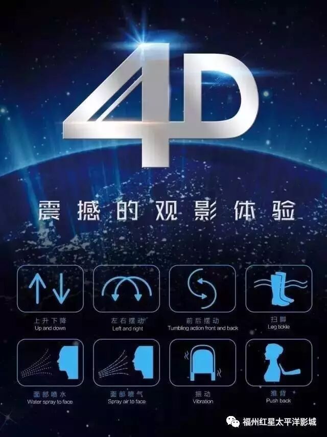 4D影院也被人们称为特效影院,4D影院特效系统分为4D动感座椅特效系统及环境特效系统.4D动感座椅特效有低频振动、升降、扫腿、耳风、喷水、滚珠、捅背等;环境特效有风、雨、雷、电、烟雾、雪花、泡泡等。