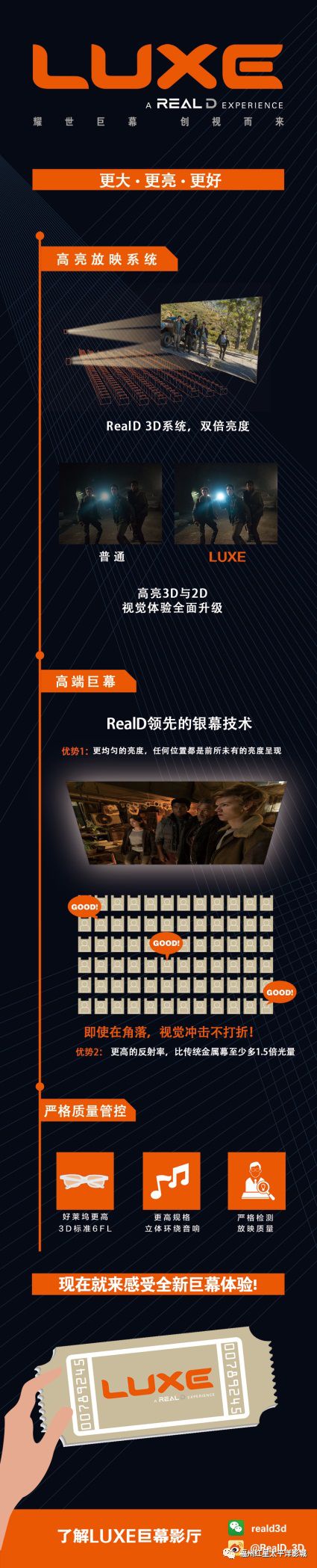 LUXE是由RealD领先技术驱动的全新巨幕品牌。按照行业高标准打造的巨幕影厅,RealD精准白幕(Precision White Screen)带来更均匀的亮度呈现,观众坐在任何位置都可以享受高亮清晰的画面。