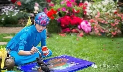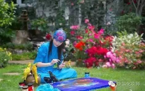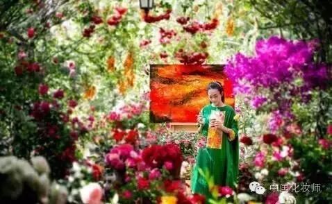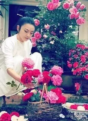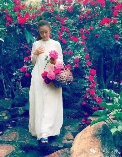 深处在花丛中的杨丽萍一脸惬意,任由鸟儿停在肩上。