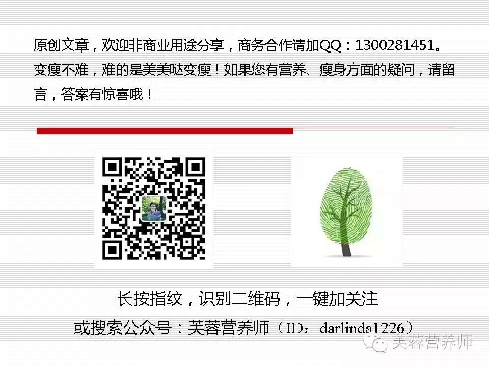 3、 高蛋白低脂肪。全天的蛋白质加起来近90克,约占到全天卡路里的30%,减肥的过程中为了避免肌肉流失,保护基础代谢,的确应该提高膳食中蛋白质的含量,特别注重优质蛋白的摄入,同时为了控制脂肪,选用的是脂肪含量最低的鸡胸肉,全天的脂肪来源仅仅是鸡蛋黄和3个核桃仁,没有烹调油、烹饪方法也是凉拌和水煮。