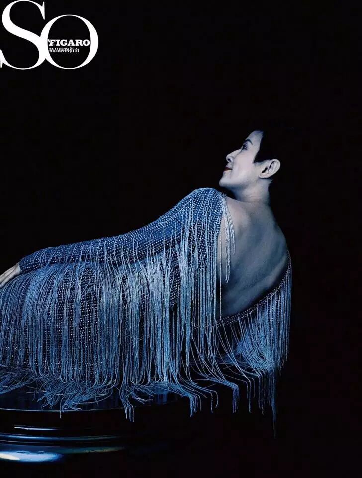 三位女星分别以不同的色彩展现女人的强大韧性,而吴君如的主题则是「Into the Blue」,在一片蓝色背景前,倚着深蓝绒布,身穿单肩土耳其蓝绸缎礼服、垂坠的银蓝流苏裙装,各式各样的蓝,让吴君如看起来坚毅又迷人。而利落短发与性感服饰让她看起来兼具女人韵味与帅气魅力,呈现出与平常不同的美丽样貌,十足迷人。