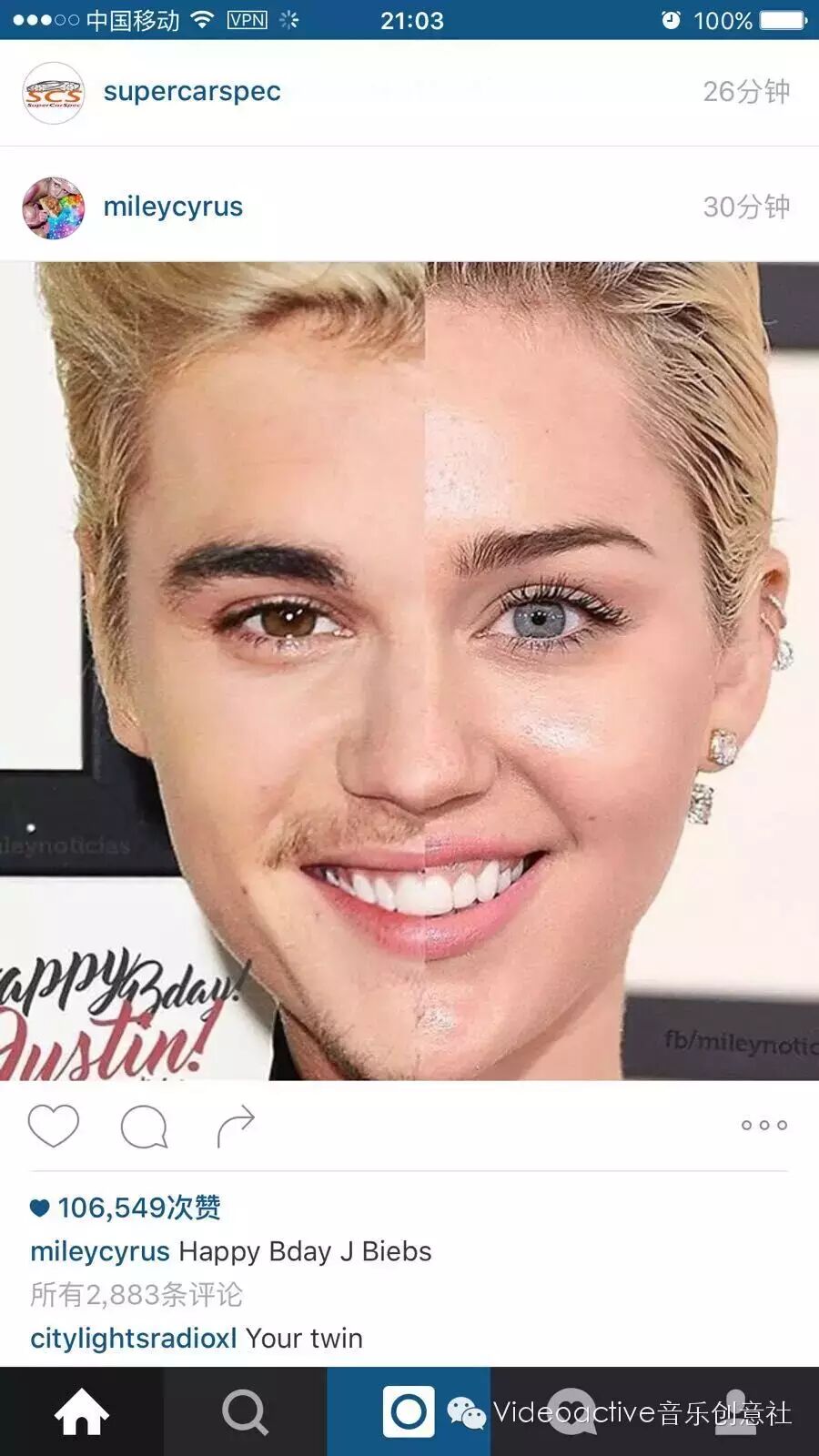 这是Miley最近发在自己Instagram上祝JB生日快乐的图。想必大家看到这里已经懂了。。。一模一样的鼻子、嘴巴、脸型和发色,眼睛除了一大一小以外形状也差不多,长得比自家人还像!!!