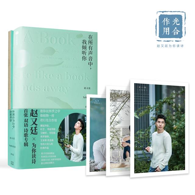 《在所有声音中,我倾听你:赵又廷为你读诗》是由「为你读诗」联合赵又廷精心打磨推出的首张中英双语有声诗歌作品集,该书由一本诗集和一张诗歌唱片两部分组成,共收录了12首诗歌,正好对应一年的12个月。
