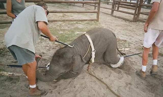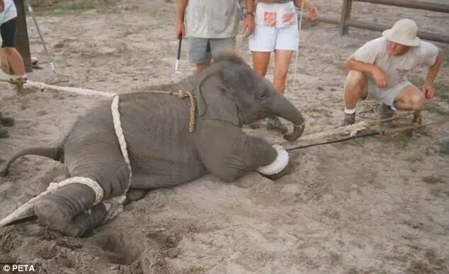 基础训练过后,训练员利用绳索和象钩强迫象宝宝躺在地上,让他们表演廉价的把戏。