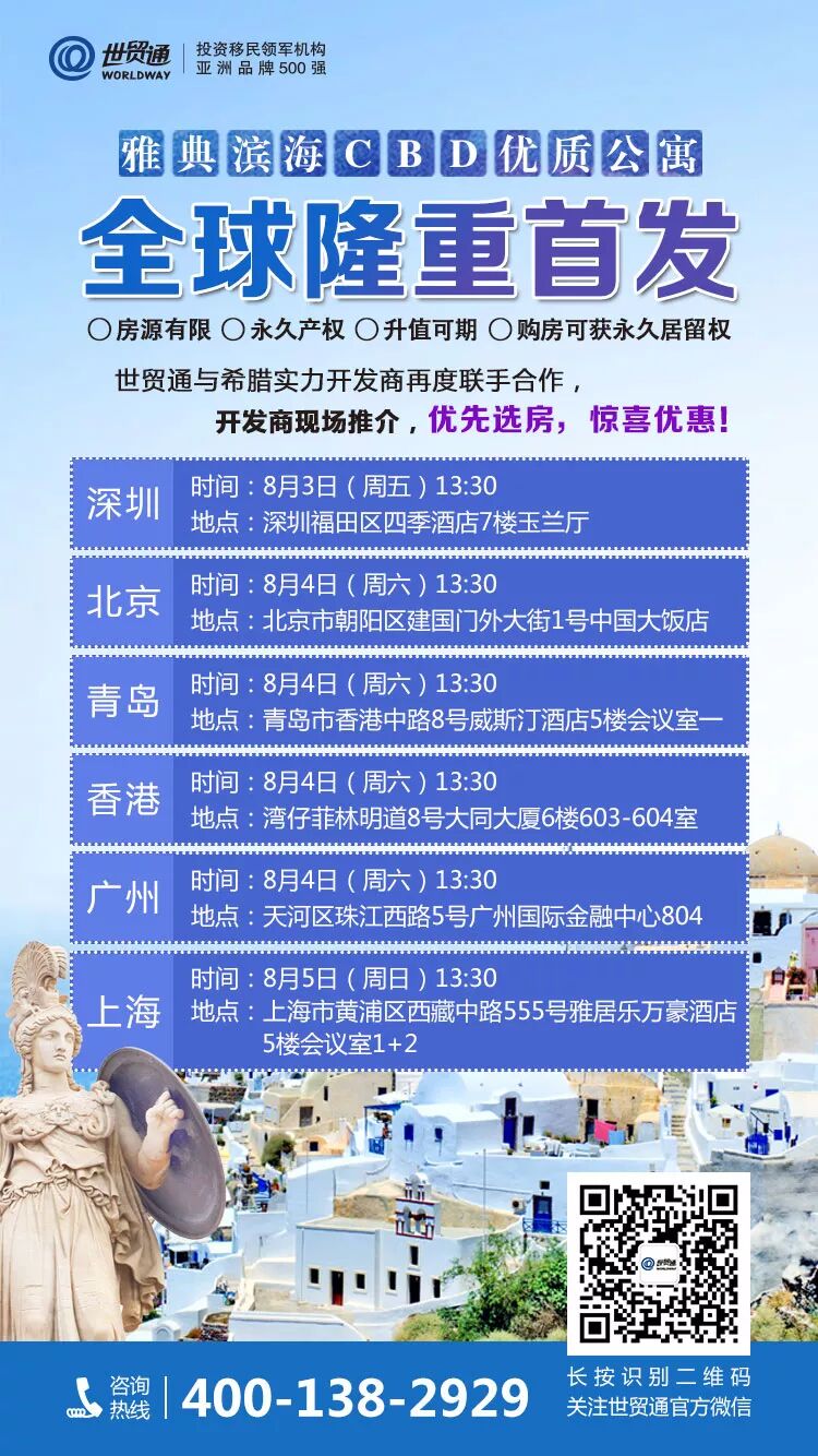 8月3日-5日,由世贸通集团推出的雅典滨海CBD优质公寓项目将在深圳、北京、香港、青岛、广州、上海全球隆重首发。房源有限,永久产权,购房可获永久居留权,开发商现场推介,优先选房!即日起,该项目已经正式进行发售,国内订房客户,可享多重优惠!目前世贸通还独家代理了该项目的8套单位,仅世贸通客户可选,数量有限,先到先得!