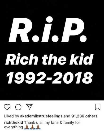Rich the Kid的社交媒体最精吸引了大批的注意,自从美国本周二他的Instagram账号发出了RIP的图片后,Rich随后发布了Instagram story进行道歉,对自己的过激行为向粉丝道歉。但现在他的另一个社交账号被一个叫做Young Navz的说唱歌手黑入。