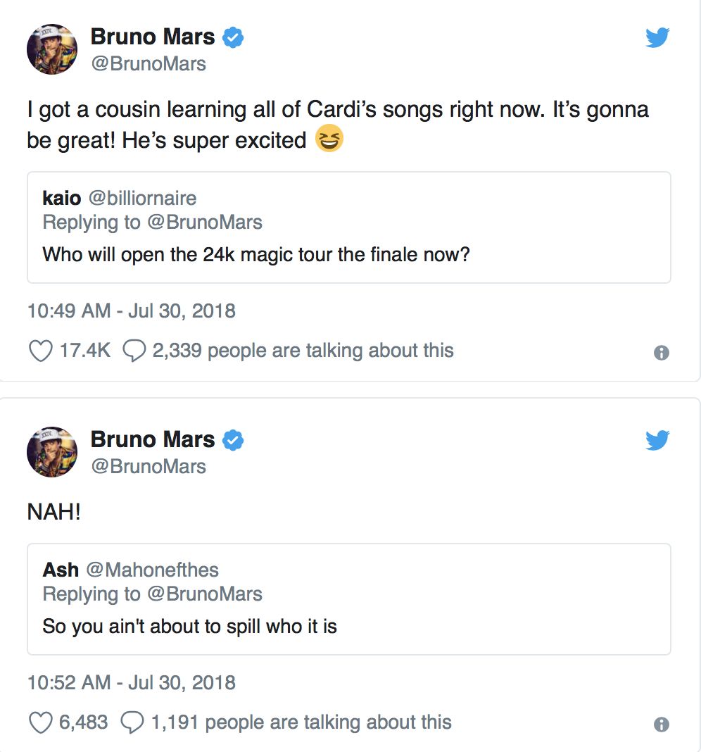 Cardi B宣布自己的将会因为要照顾自己新出生的孩子Kulture而无法如期参与到Bruno Mars的演出中,Bruno Mars也在Twitter上打趣到新的开场嘉宾将会很快宣布。