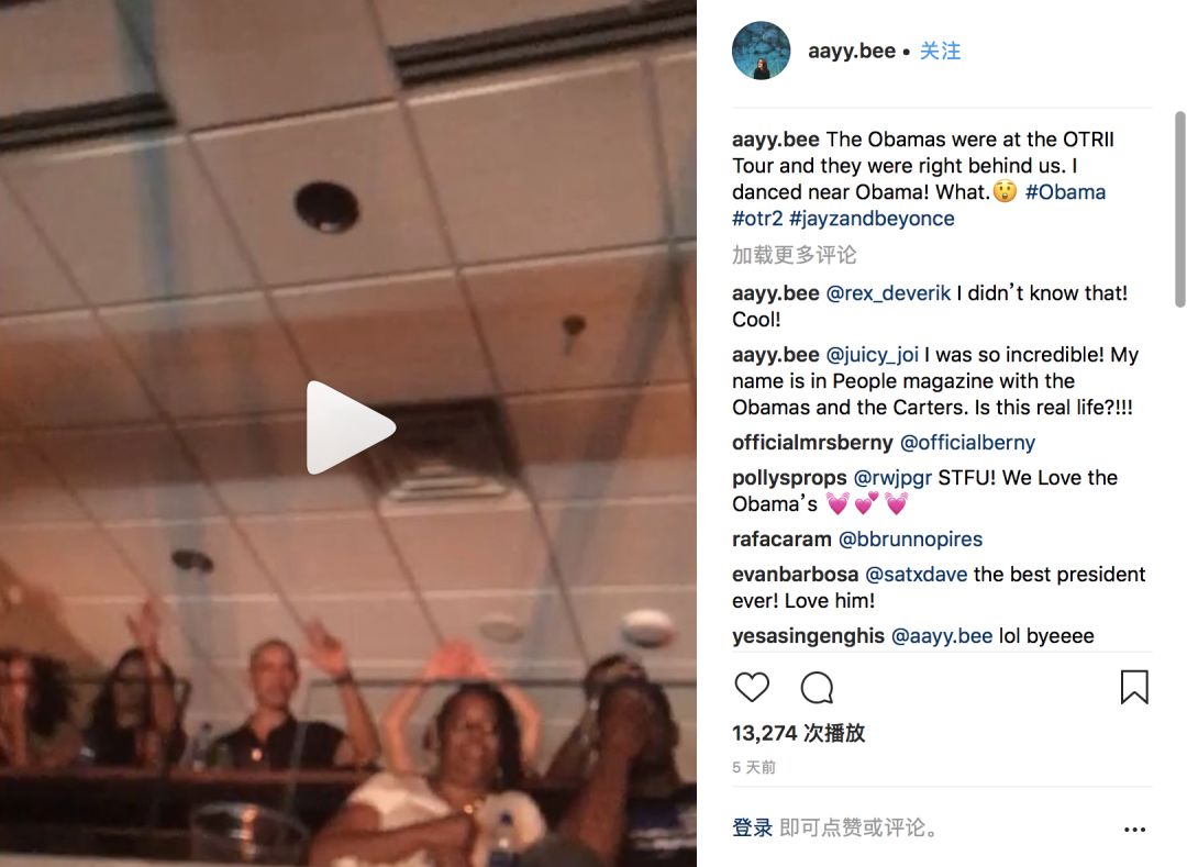 到场的粉丝拍下了多组视频上传到了Instagram之上,视频中可以看出奥巴马夫妇正在包厢中跳舞和挥舞着双手。这也是The Carters在美巡演的第二场演出。早在他们欧洲巡演时,米歇尔就与Beyonce的母亲一起在巴黎观看的演出。