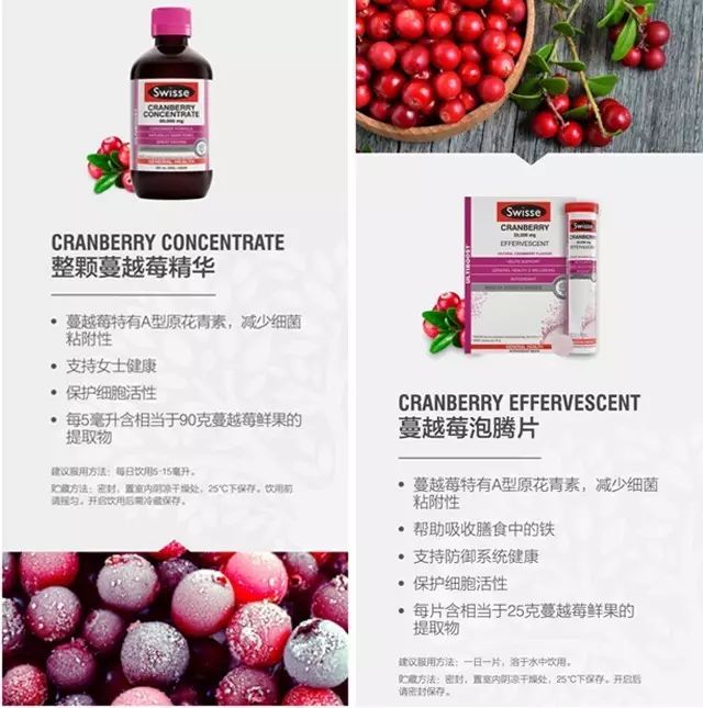 蔓越莓被称为是女性朋友的贴心小闺蜜,可以减少细菌的粘附性,守护女性健康。Swisse的蔓越莓系列产品:Swisse蔓越莓精华、Swisse蔓越莓泡腾片也深受妹纸们青睐。