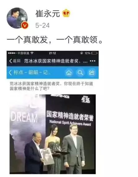 范冰冰获得“国家精神造就者荣誉”,小崔微博直言:“一个真敢发,一个真敢领”
