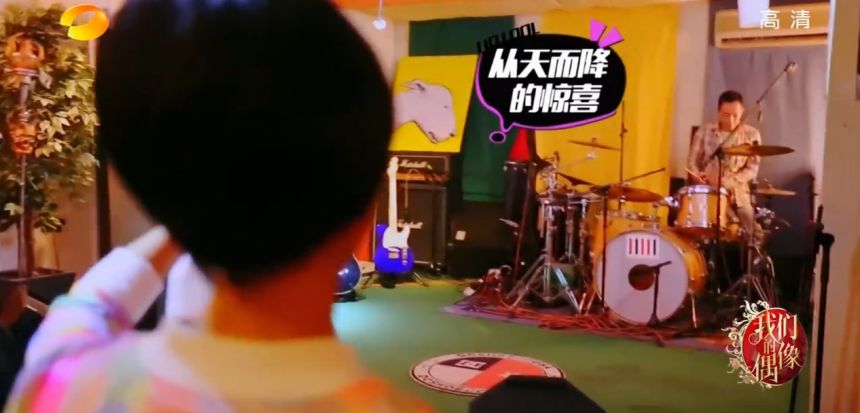 去年朱茵在《偶像来了》里面探班黄贯中,他一看到老婆来就一脸兴奋,马上从架子鼓后面跳出来。