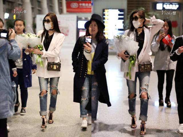张天爱选择将这套白色职业款西装上衣单穿,搭配钟情的破洞牛仔裤,随性中袭来满满的霸气,穿上这条Rag & Bone脚踩Jimmy Choo细高跟凉鞋,视觉效果腿长两米二!