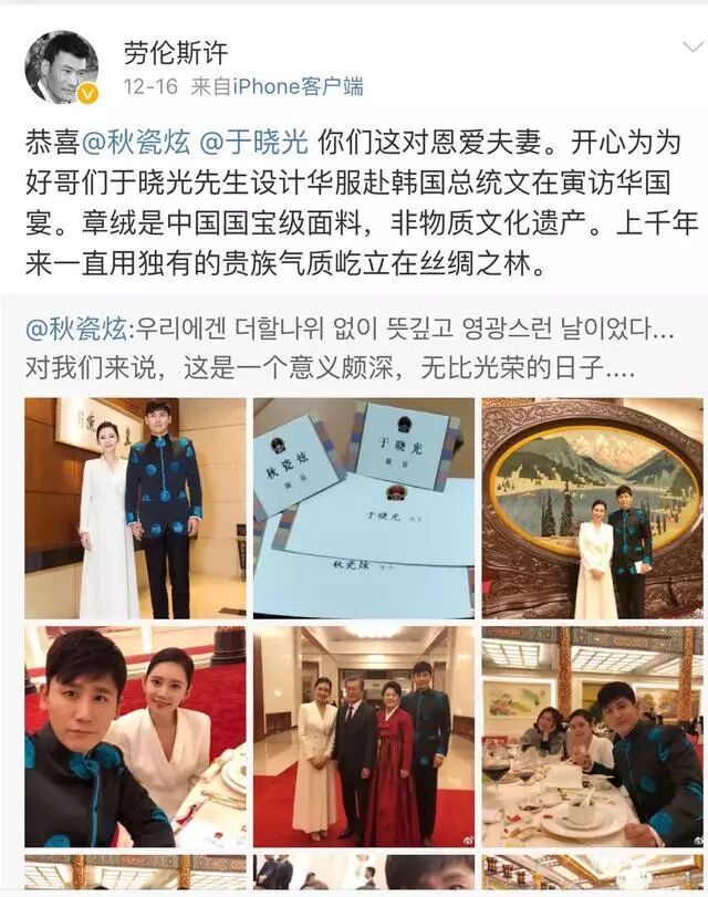 和于晓光这一身庄重的服装相搭配的秋瓷炫的衣服选用的是比较简单的白色,两个人站在一起,相互辉映,既不会感到过于单调,但也不会显得过于花哨。