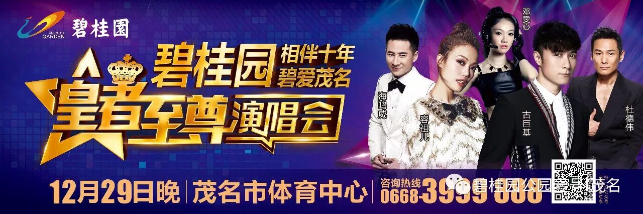非凡的一年注定要以非凡的方式来鉴证。“相伴十年,碧爱茂名”--碧桂园皇者至尊演唱会将于12月29日在茂名体育中心举行,届时将同乐坛巨星古巨基、容祖儿、杜德伟、海鸣威、邓雯心和800万茂名人一起共同见证碧桂园非比寻常的一年。