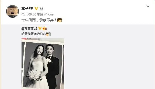 2017年,他们爱情长跑的第十年,两人结婚了,一句“明天我要嫁给你啦”,一句“十年风雨,承蒙不弃!”。