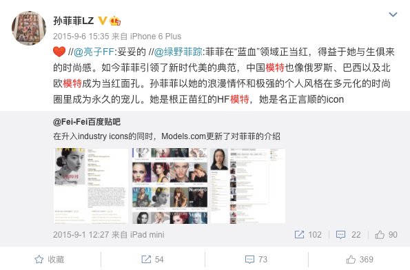 秀场上走透透的期间,孙菲菲在代言方面的势头也很强劲。2011年就成为了第一个和CHANEL签约的中国模特,包括CHANEL彩妆线以及腕表系列,都能看到孙菲菲出镜。后来,孙菲菲又拿下了Louis Vuitton 2011秋冬系列广告代言,无疑成为一线大牌亚洲新宠(孙菲菲2011年进入了MDC排名前五十)。