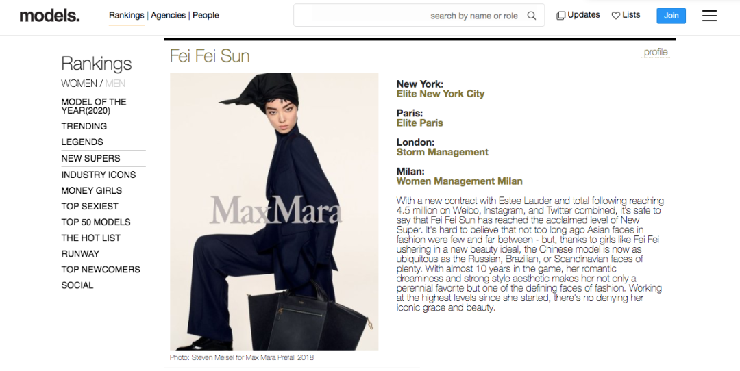 早在10年前她就被models.com评选为全球超模Top12。现在,她也已经步入New Supers(顶级超模)行列,地位仅次于Legends(只有Kate Moss、Naomi Campbell这些已成为时代烙印的传奇超模才能称为Legends),除此之外她还位列“industry icons”名单,江湖地位不容小觑。