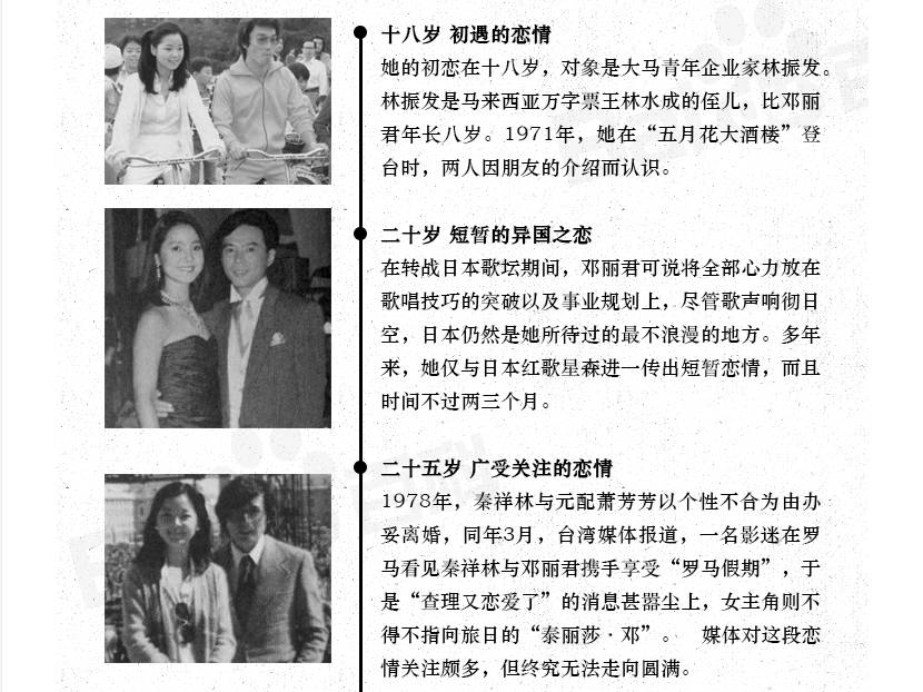 18岁的初恋林振发、二十岁的跨国恋森进一、二十五岁与之携手共享“罗马假期”的秦祥林、二十六岁扑所迷离的成龙、二十八岁的豪门恋郭孔丞、三十七岁的姐弟恋保罗;