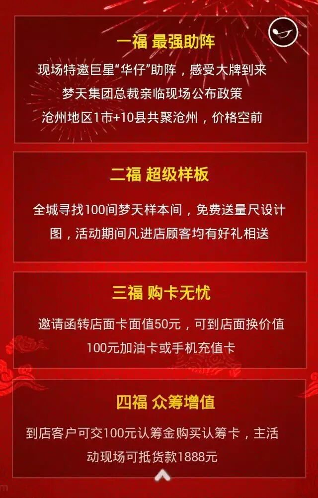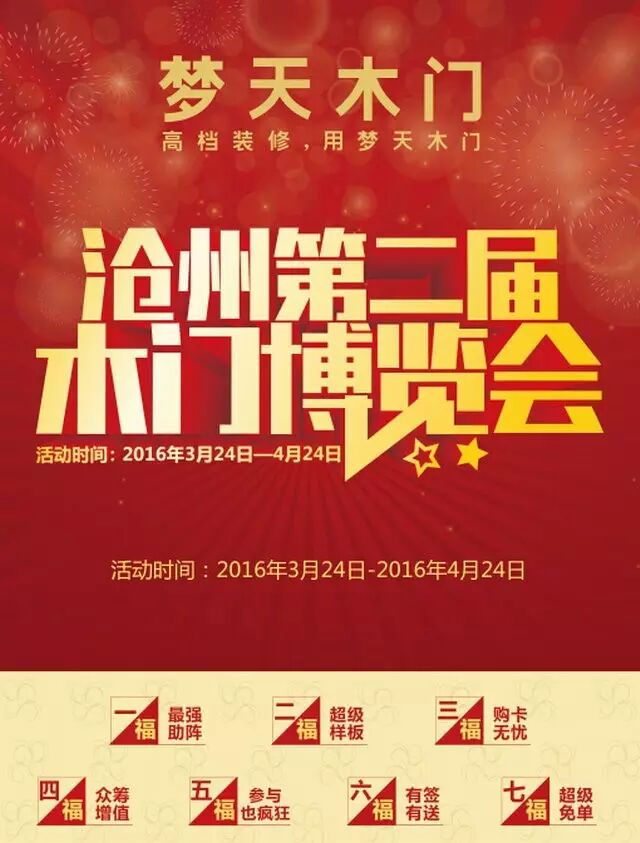 高档装修,用梦天木门。沧州第二届木门博览会来啦,活动时间3月24日至4月24日。现场特邀巨星“华仔”亲临现场,与您零距离接触。另交50元购买邀请函,活动当天可到店面兑换100元加油卡或手机充值卡。不止这些,还有超级样板、众筹增值、万元红包、有签有送、超级免单等。活动详情继续往下看。