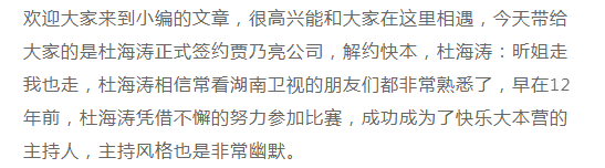 近日,贾乃亮的公司童乐影视在社交平台发布了一篇文章,也表明了杜海涛正式和贾乃亮的公司签约,主持人身份即将改变为演员,也就是说杜海涛已经和快乐大本营解约了合同,是什么让杜海涛放弃了12年的主持生涯呢?这让我们想起了曾经和杜海涛一起进入快本的吴昕,当时进入快本的时候杜海涛获得了第一名,第二名就是吴昕,但是吴昕确实第一个离开快本的。
