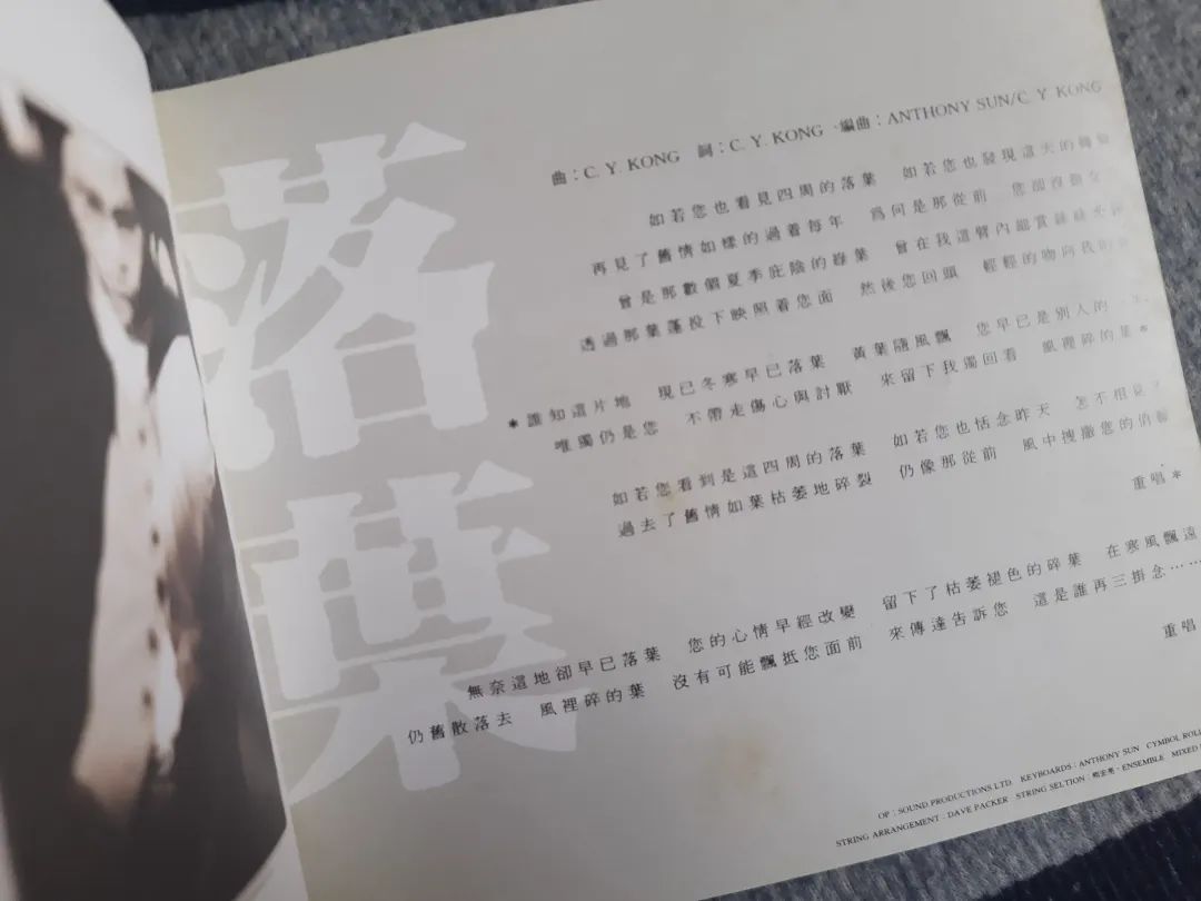 一向很有个性的C.Y.Kong(本名江志仁),在苏永康的这张专辑里,却贡献了一首比较“芭乐风格”的歌曲《落叶》。更罕见的是,这首歌竟然也是C.Y.Kong自己填词的,这让我有理由相信《落叶》很可能是Kong自己的感情故事。编曲的部分除了Kong的弦乐铺垫之外,还有Anthony Sun(孙伟明)的钢琴伴奏,虽然是大路抒情曲,但作为专辑的收尾却一点不显轻浮。