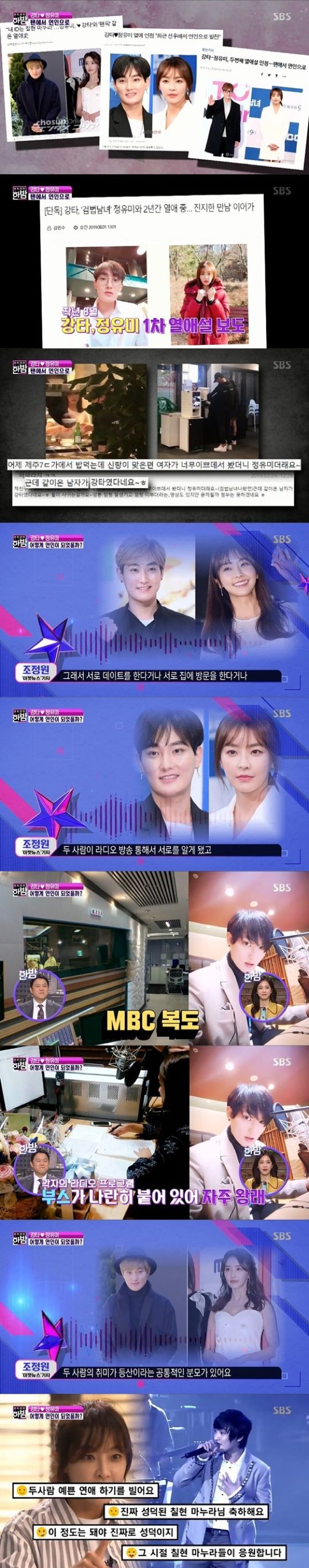5일 밤 방송된 SBS 연예 프로그램 '본격연예 한밤'(이하 '한밤')에서는 최근 열애를 공식적으로 인정한 배우 정유미와 가수 강타의 소식이 전해졌다.