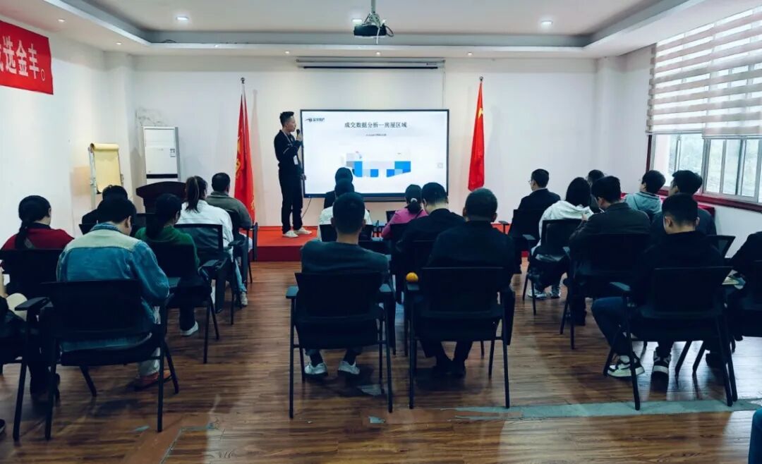 大会正式开始,金丰房产签约部部长易达棋凭借10月份的成交数据,深入剖析了市场动态,旨在为大家指明接下来的工作方向。在数据解读告一段落后,易部长带领大家回顾了公司年初设立的年度奖项,并向大家公布了截至目前,公司2024年团队及个人业绩排名情况,他鼓励全体同仁在余下的一个多月时间里,全力以赴,力争上游,站上年末的荣誉奖台。