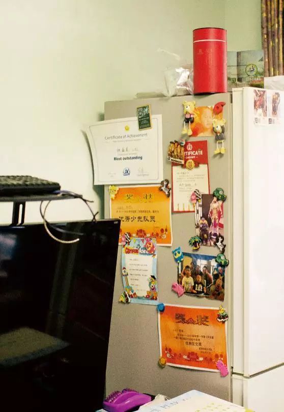 家中的冰箱和墙上贴着草根的奖状、荣誉书和与同班“兄弟姐妹”的合影