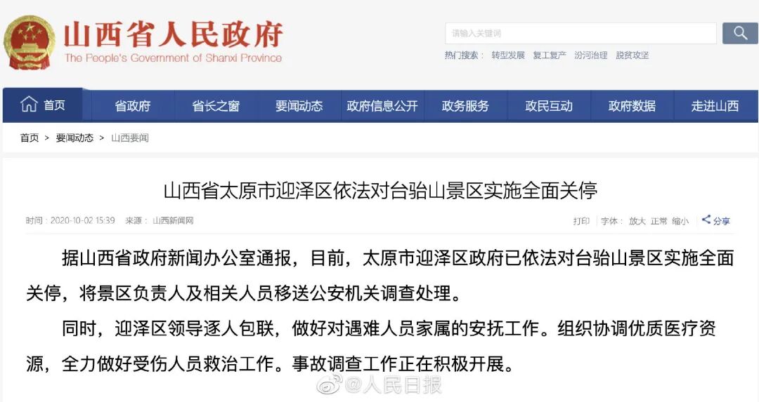 据山西省政府新闻办公室通报,目前,太原市迎泽区政府已依法对台骀山景区实施全面关停,将景区负责人及相关人员移送公安机关调查处理。事故调查工作正在积极开展。10月1日下午一点零四分,山西省太原市迎泽区小山岩村台骀山景区冰灯雪雕馆发生火灾。现场共搜救出28人,其中13人遇难。