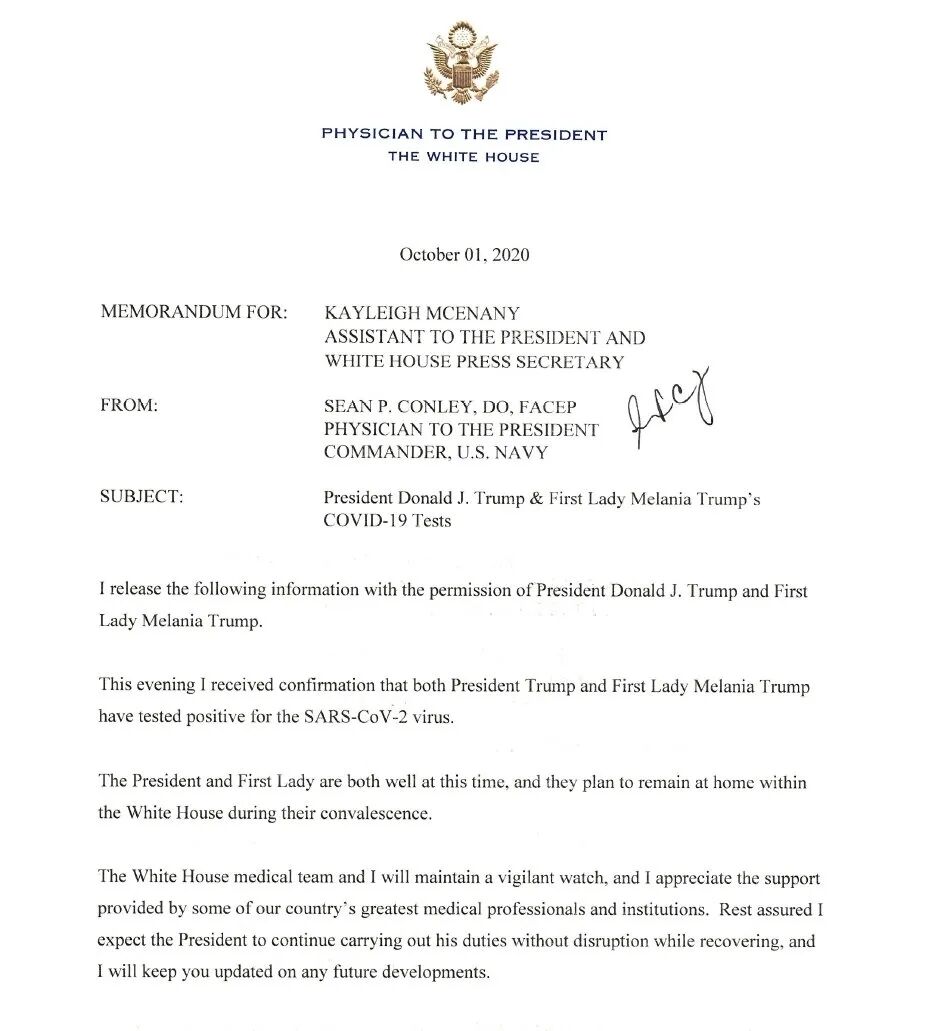 白宫医生肖恩·康利在声明中确认,特朗普和梅拉尼娅新冠病毒检测呈阳性,并表示两人目前状况良好。两人康复期间将留在白宫家中。