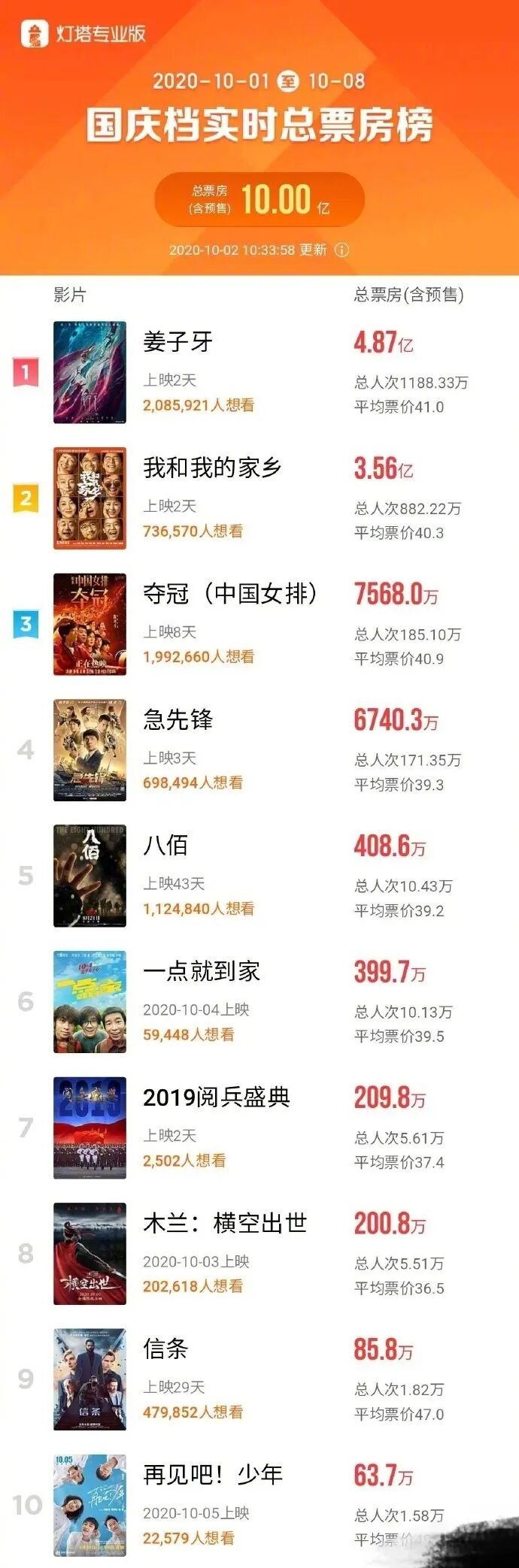 据灯塔实时数据,截至10月2日上午,国庆档期内(10月1-8日)总票房(含预售)破10亿元。#姜子牙票房破5亿#暂居国庆档总票房冠军,《我和我的家乡》3.6亿,9月25日上映的《夺冠》累计票房已达3.5亿,9月30日上映的《急先锋)1.2亿。