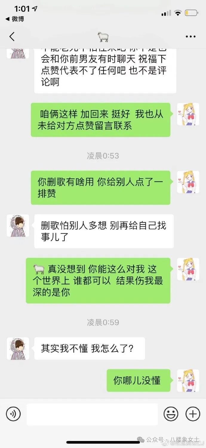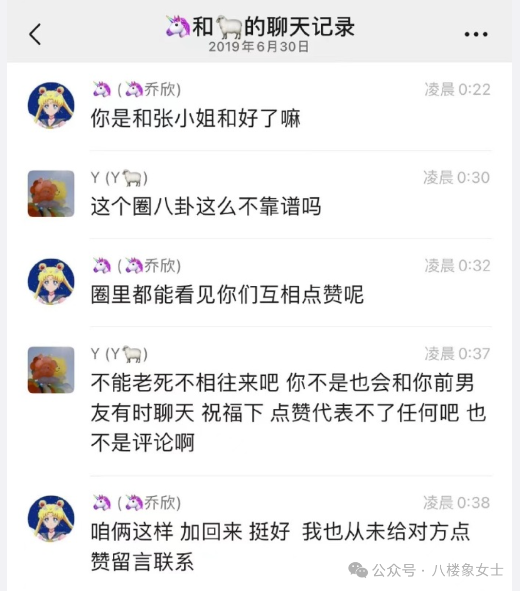 乔欣问杨洋是不是和张小姐和好了,杨洋没有正面回答,说和张小姐聊天点赞也不代表什么,总不能老死不相往来,随后将话题转回到乔欣身上,“你不也和你前男友有时候聊天吗?”对此乔欣表示自己没有,还说和杨洋加回好友这样相处挺好的。