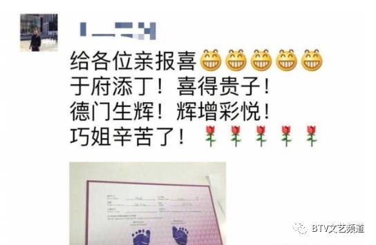 随后她在朋友圈上传了小宝宝的脚印照,还有与老公于冬在产房的合照,照片中夫妇俩一脸幸福。于冬也在朋友圈发文道“给各位报喜,于府添丁!喜得爱子!德门生辉!辉增彩悦!巧姐辛苦了”。