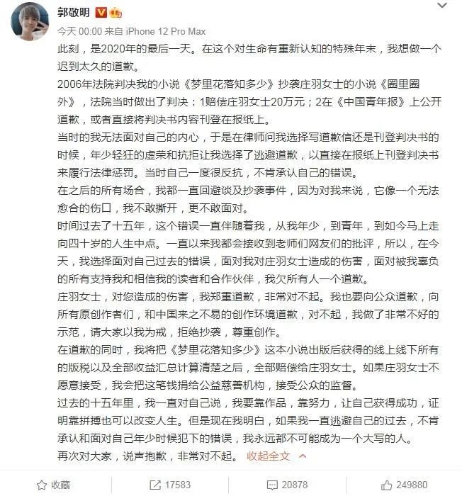 真正打过官司的是《梦里花落知多少》抄袭庄羽的《圈里圈外》,郭敬明败诉了。