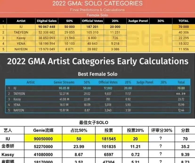 本来挺高兴的一件事儿,谁知网上竟曝出各类奖项候选人评分,其中女solo得分排名中,原先IU为最高分,最后拿奖的却是泰妍。